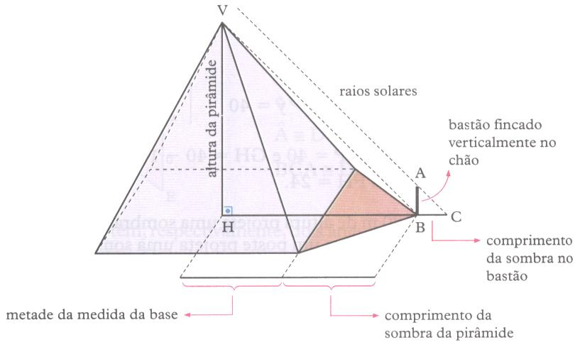 Usando um bastão, Tales aplicou os seus conhecimentos sobre segmentos proporcionais, pois a razão entre a altura da pirâmide e o comprimento da sua sombra projetada por esse bastão.